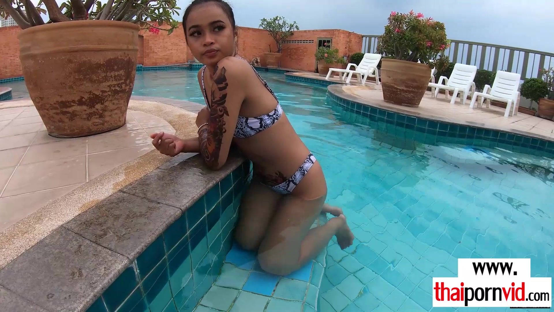 Petite amateur inked Thai teen Miw with small tits looking hot in her bikini She plays in the water then she goes back to her hotel room where she starts sucking her european lovers white cock harder and harder making it grow and ready to fuck