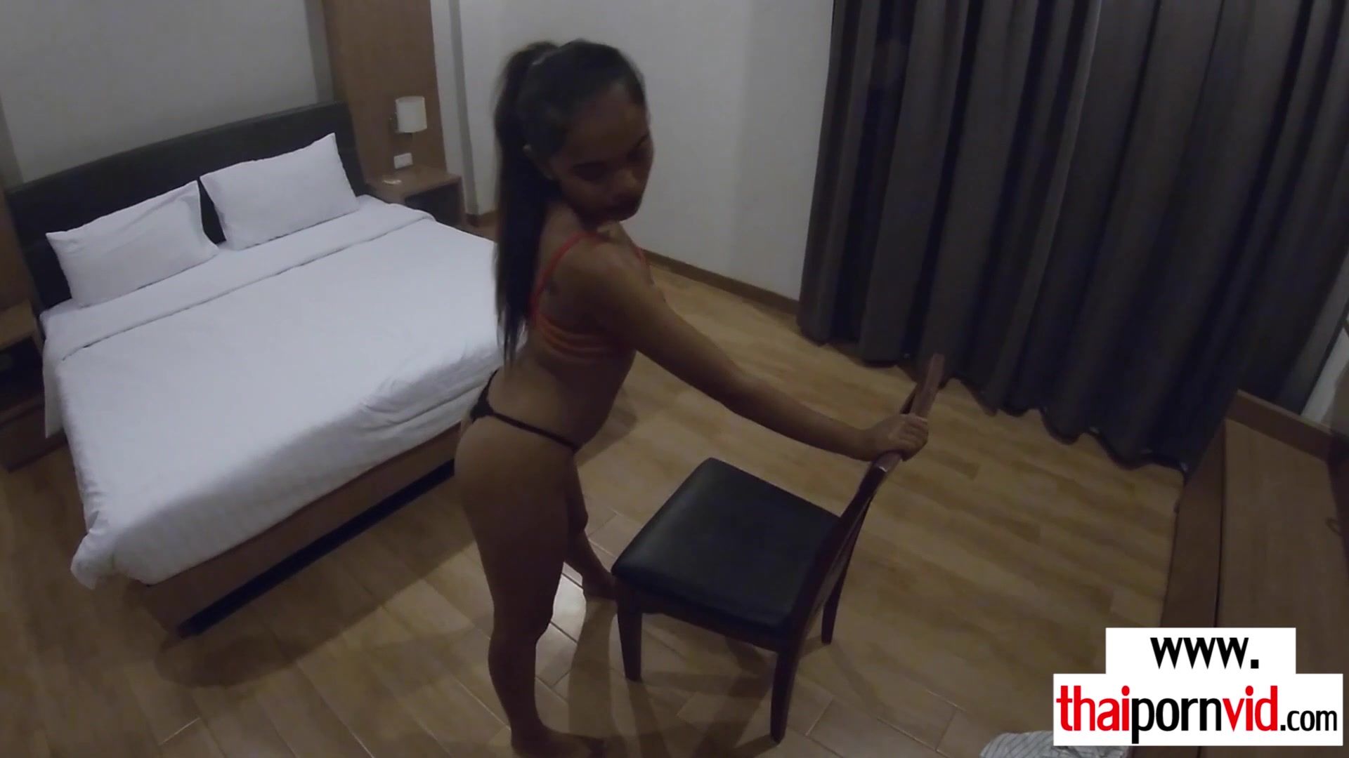Petite amateur Thai teen Cherry with small tits is presenting a hot striptease then she starts masturbating to make her european lovers big white cock hard then she takes it and after a blowjob he is banging her tight asian pussy hard in doggystyle