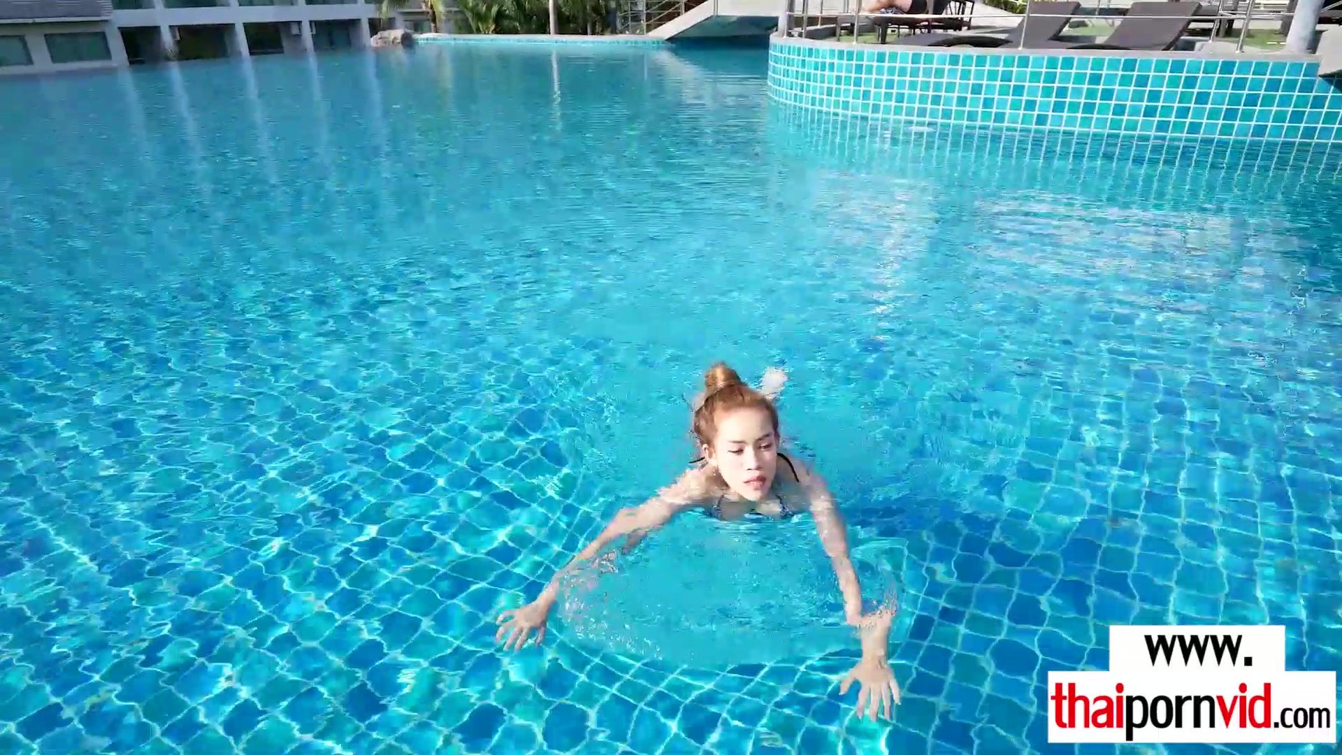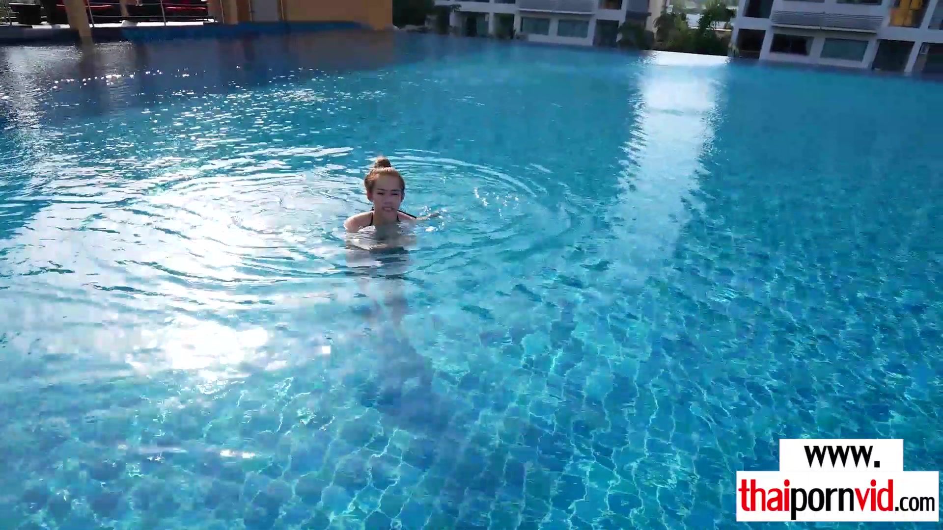 Hot amateur Thai babe Hana with big boobs is swimming in the pool and after her workout she goes back to her hotel room to relax on her european lovers big white cock She is sucking his cock to make it hard then she bends over to get the huge meat