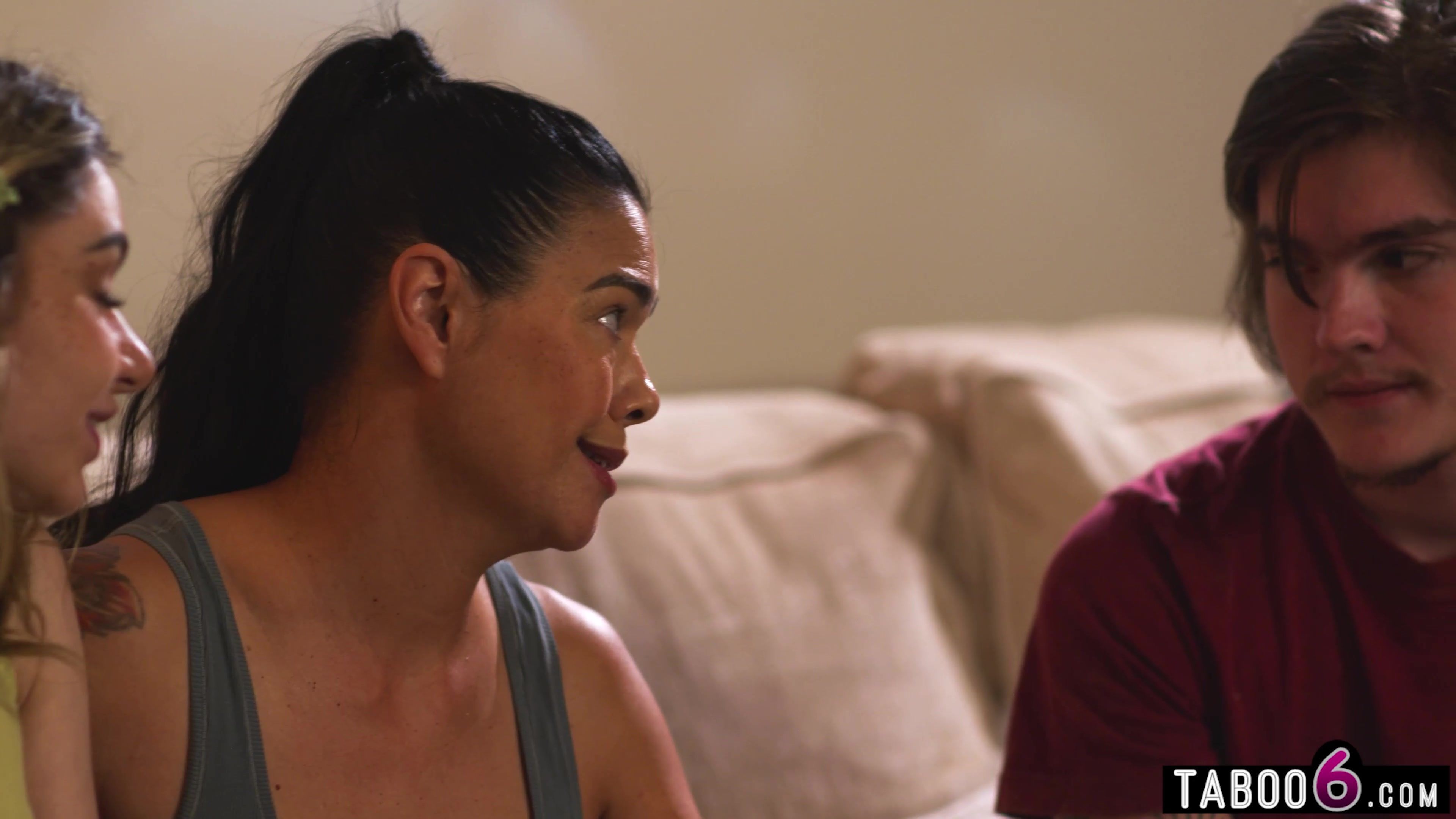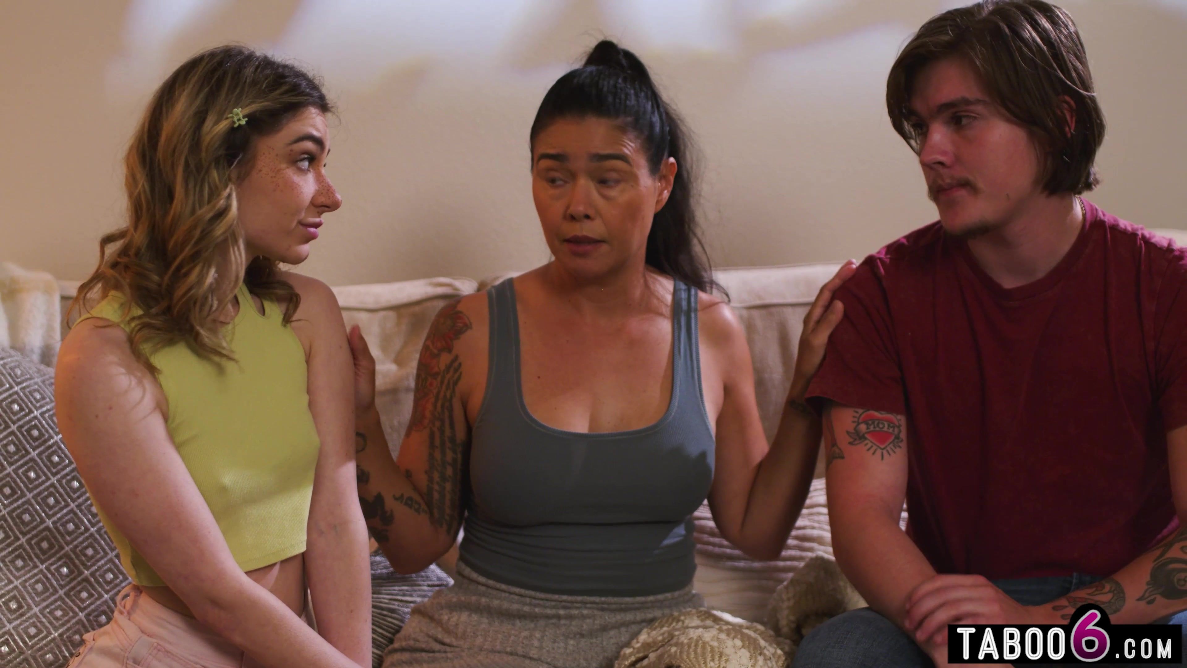 Stepdaughter and stepson really scared after seeing a scary movie so mature stepmom Dana Vespoli comforted them by having them suck on her big tits! One on each side and one thing lead to another in this dirty family taboo threesome!