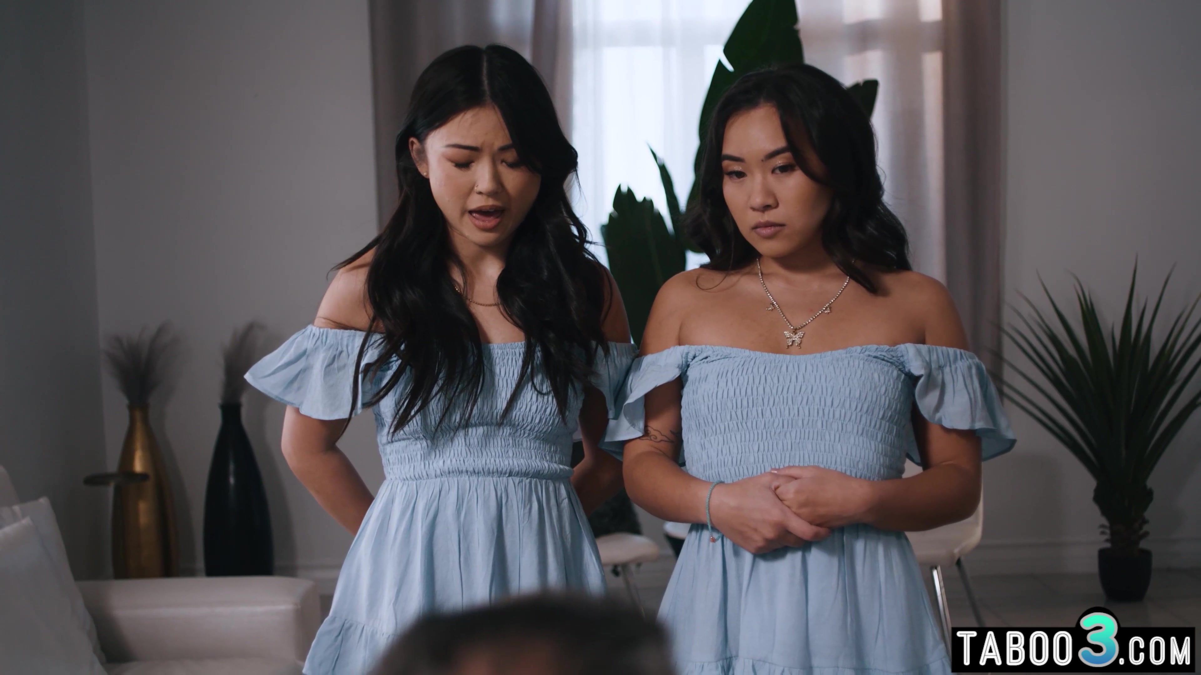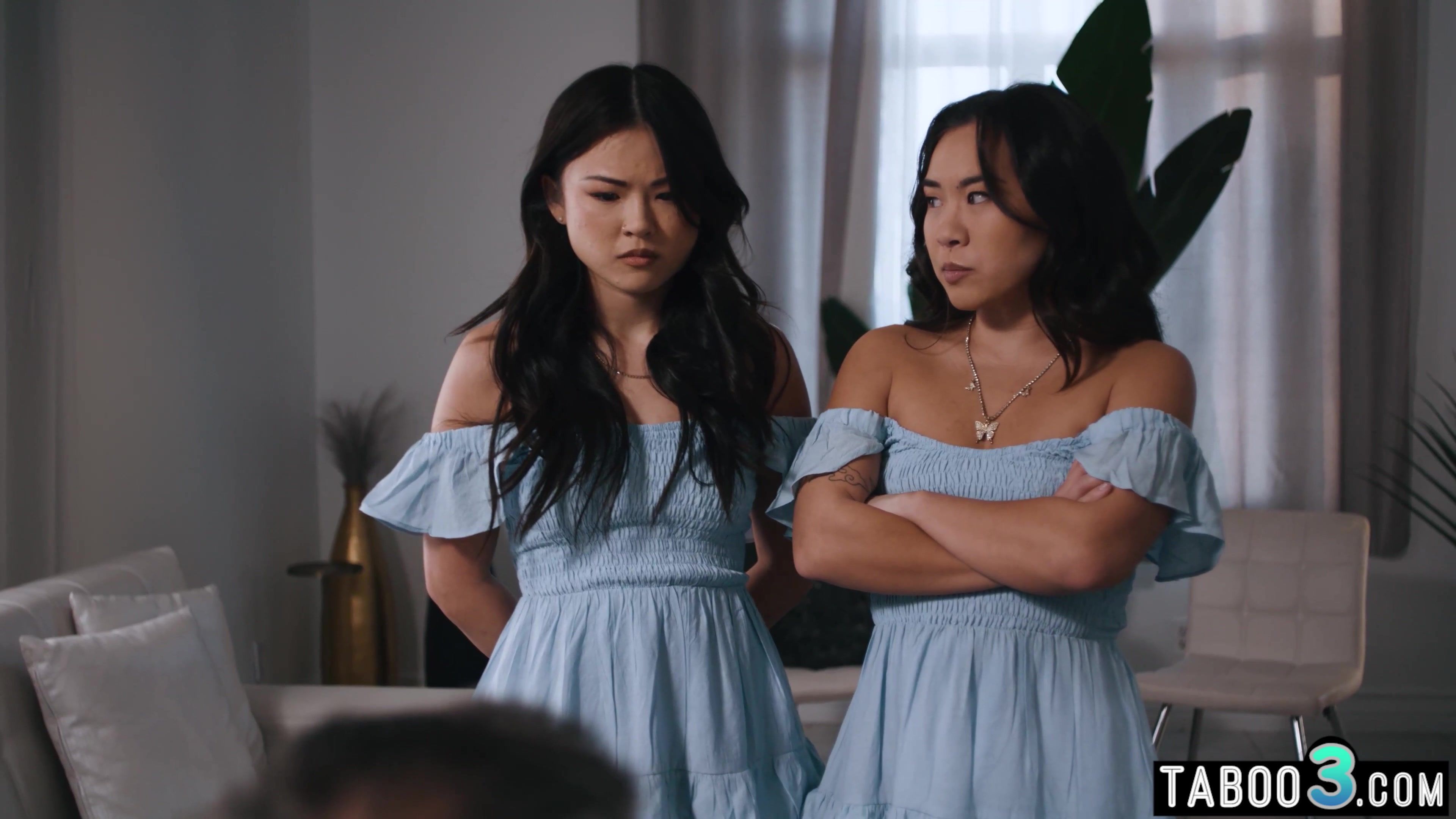Perv stepfather has an erotic obsession with twins so he seduces and lures his two petite asian teen stepdaughters Lulu Chu and Kimmy Kimm into taboo threesome fuck The small titted sluts are sucking his cock and lets him to fuck their exotic pussies