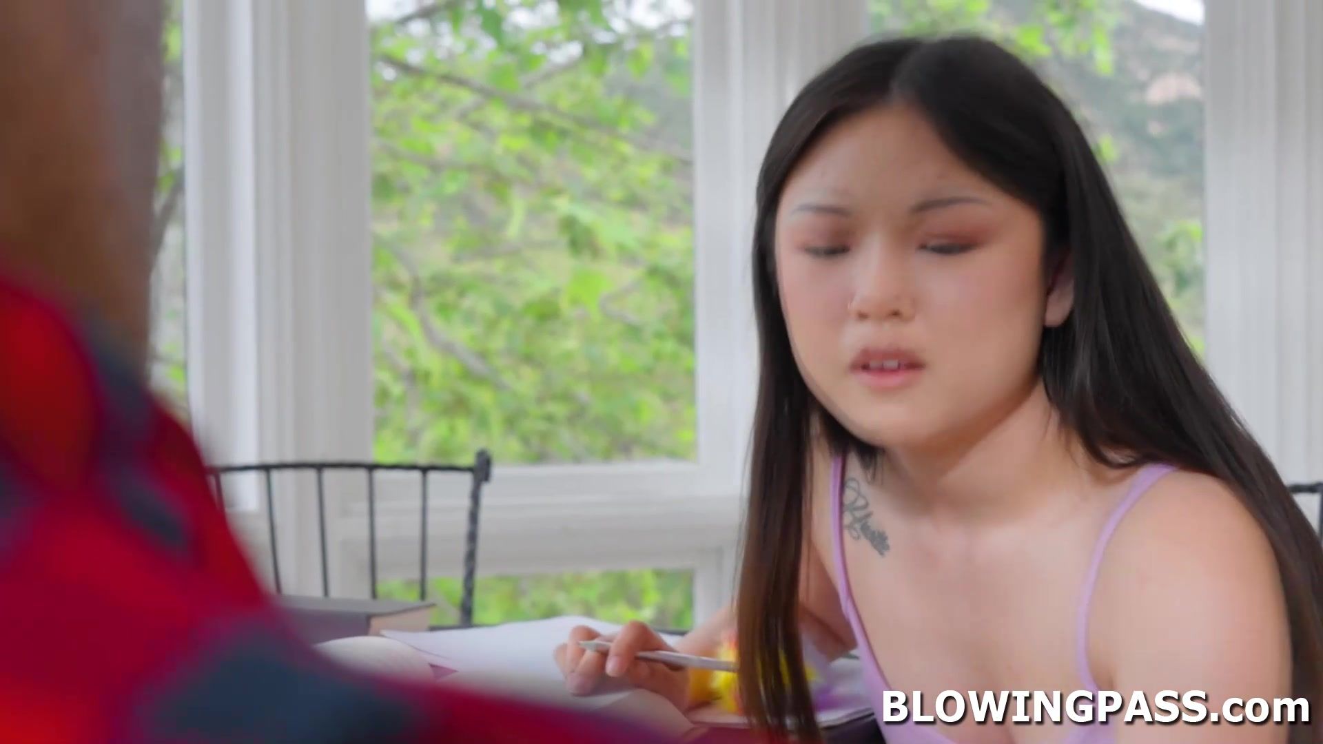 Petite asian teen student giving her private tutor blowjob