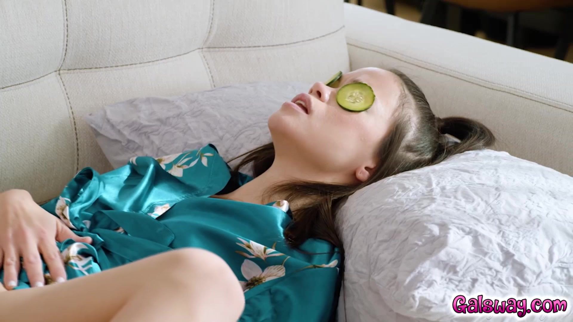 Angelina Moon is having an at home spa day But a short time later Alison returns because she forgot her purse Angelina still has cucumber slices over her eyes so she mistakenly thinks her husband has come home early and invites Alison to pleasure her