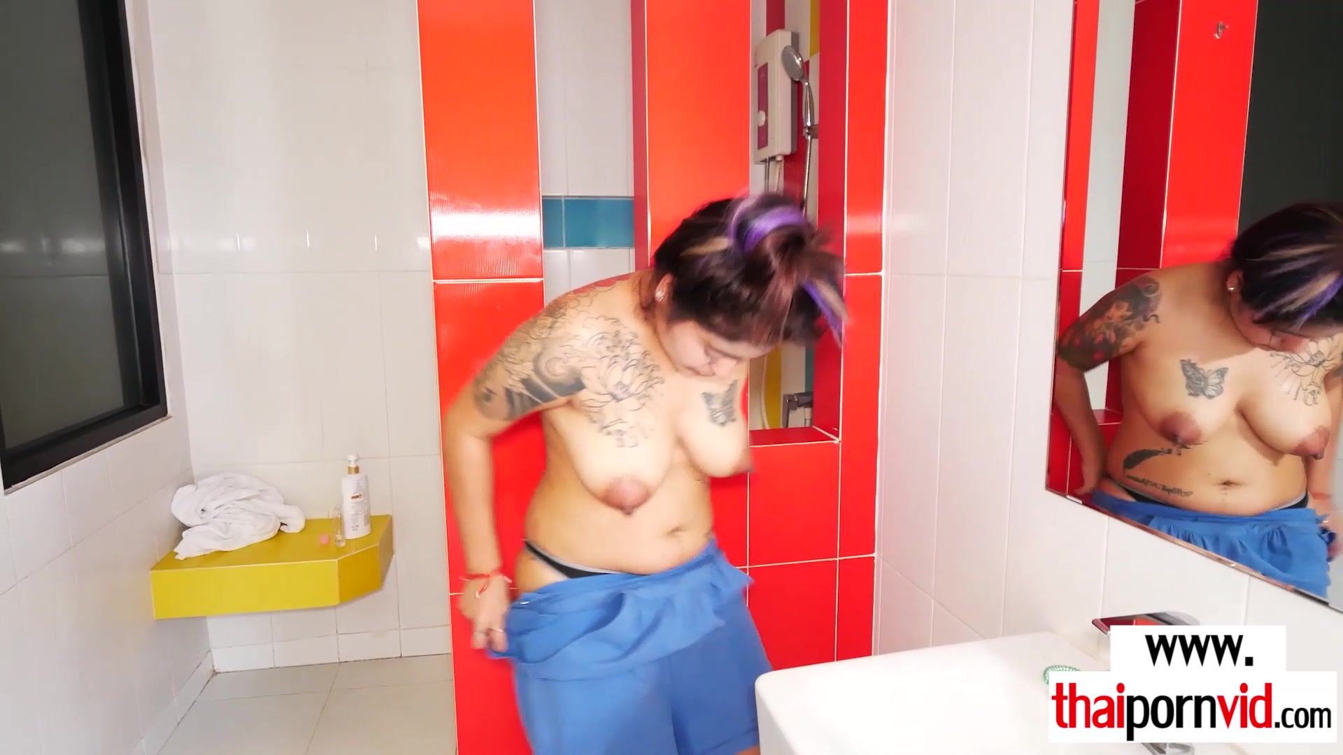 Amateur Thai slut Mimi with big floppy tits is creaming her body to prepare herself for her next european client who comes and she is sucking his big white cock then he is fucking her boobs and her asian pussy